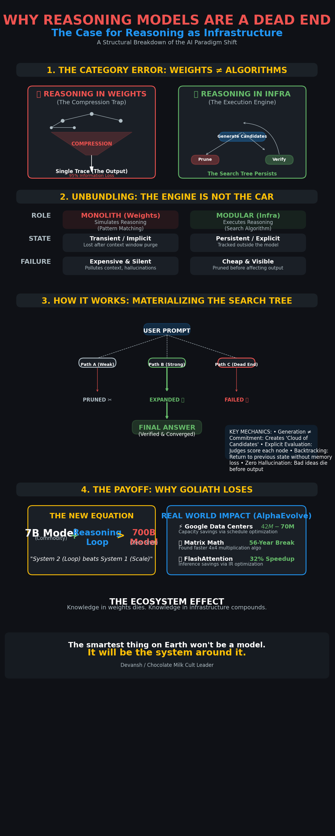 The solution is not better training but a different abstraction: reasoning as infrastructure. Models generate candidates; external systems handle control flow — branching, evaluation, pruning, backtracking, and state. Candidates become first-class objects. Failures are cheap and visible. Judges score explicitly. The search tree is materialized, auditable, and debuggable. Generation stops being commitment.
