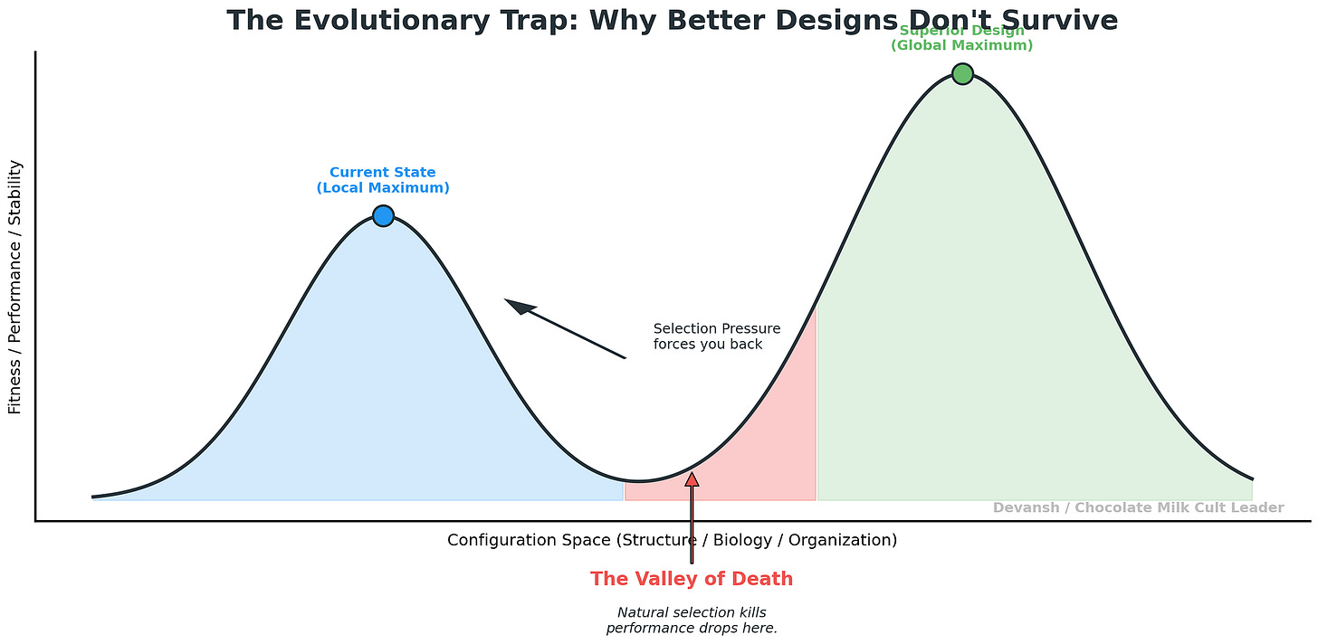 These objectives are directly opposed. Any intermediate uncertainty, branching, or self-critique that doesn’t improve loss gets progressively eliminated. This is the LLM variant of the idea behind the evolutionary valley, one of the most important systems concepts for anyone to know. In a nutshell it can be explained as follows: A system — biological, technological, organizational — can see a higher peak ahead, but to reach it, it must first get worse. It must pass through a dip in performance, stability, or fitness before climbing to a superior design. Evolution avoids these valleys because natural selection punishes anything that loses capability, even temporarily. Many pure researchers/engineers always think in terms of great end result, w/o understanding that their proposed solutions will carry a lot of short term pain and thus likely to be shut down by management (who can’t truly understand the better outcomes). This is why communication is key for engineers, see our guide here).
