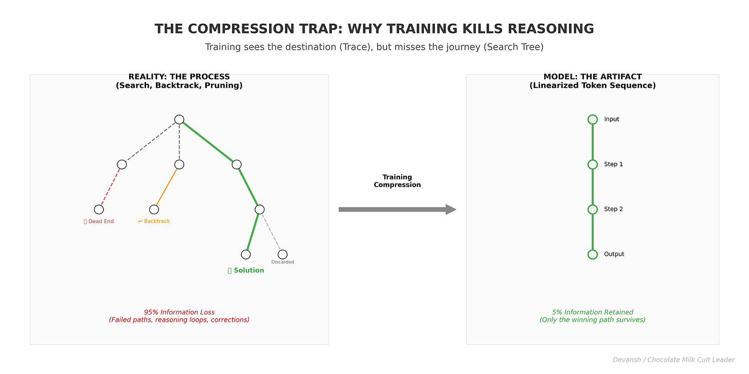 When you train on this trace, you’re training on maybe 5% of the actual reasoning process. The model learns to produce outputs that look like the 5% you showed it. The 95% that actually constitutes the search — invisible.