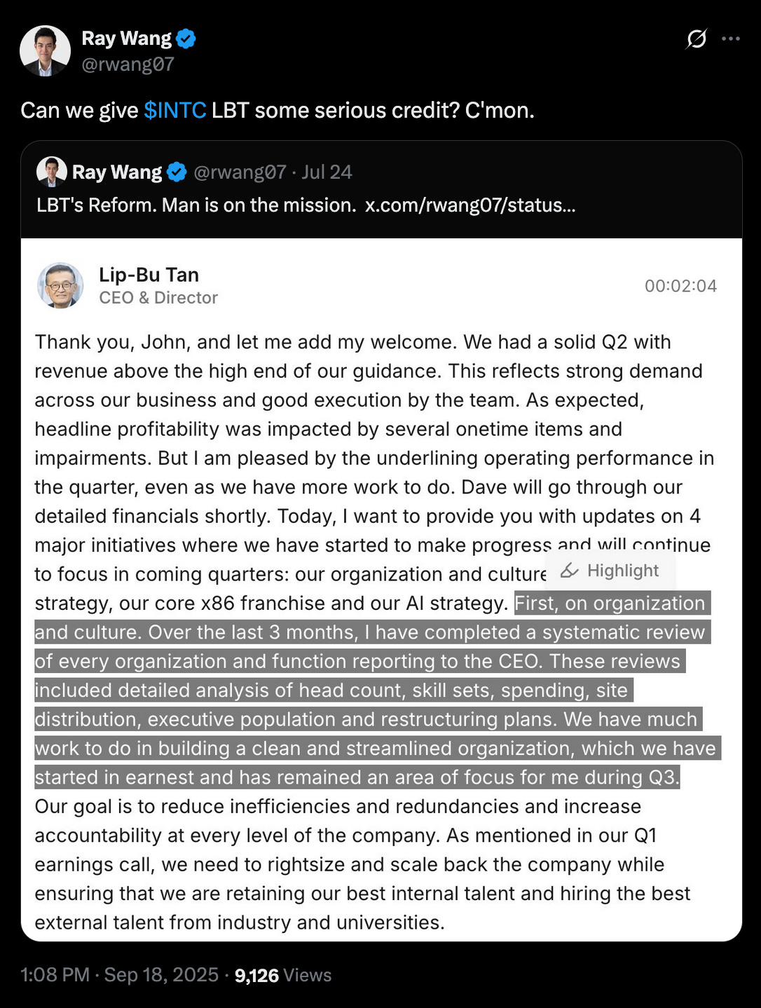 Lastly, let’s give some credit to Intel’s LBT (and Jensen as well). As I said, Bro is on the mission to save the company, and no doubt he is a legend in semis.