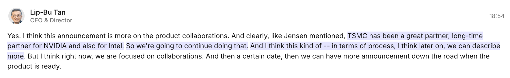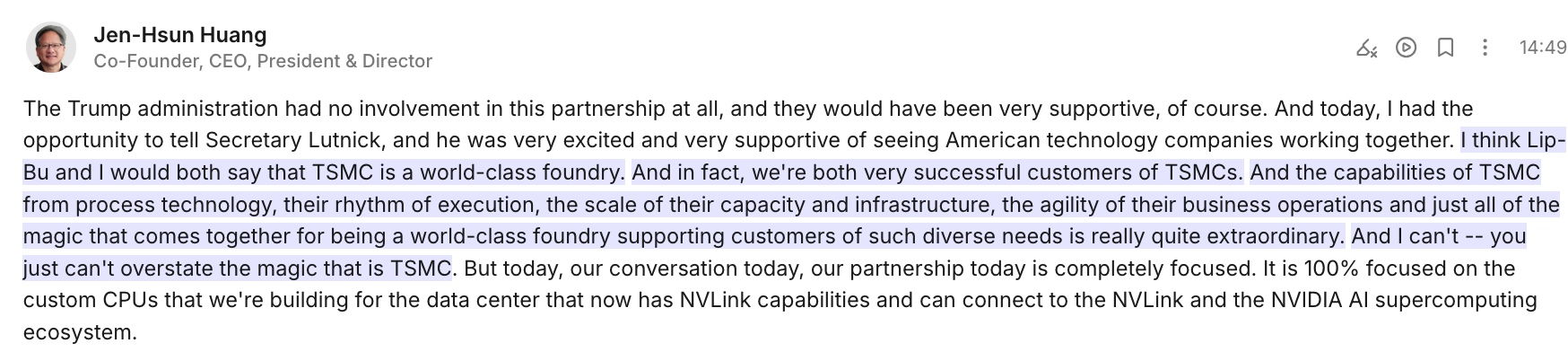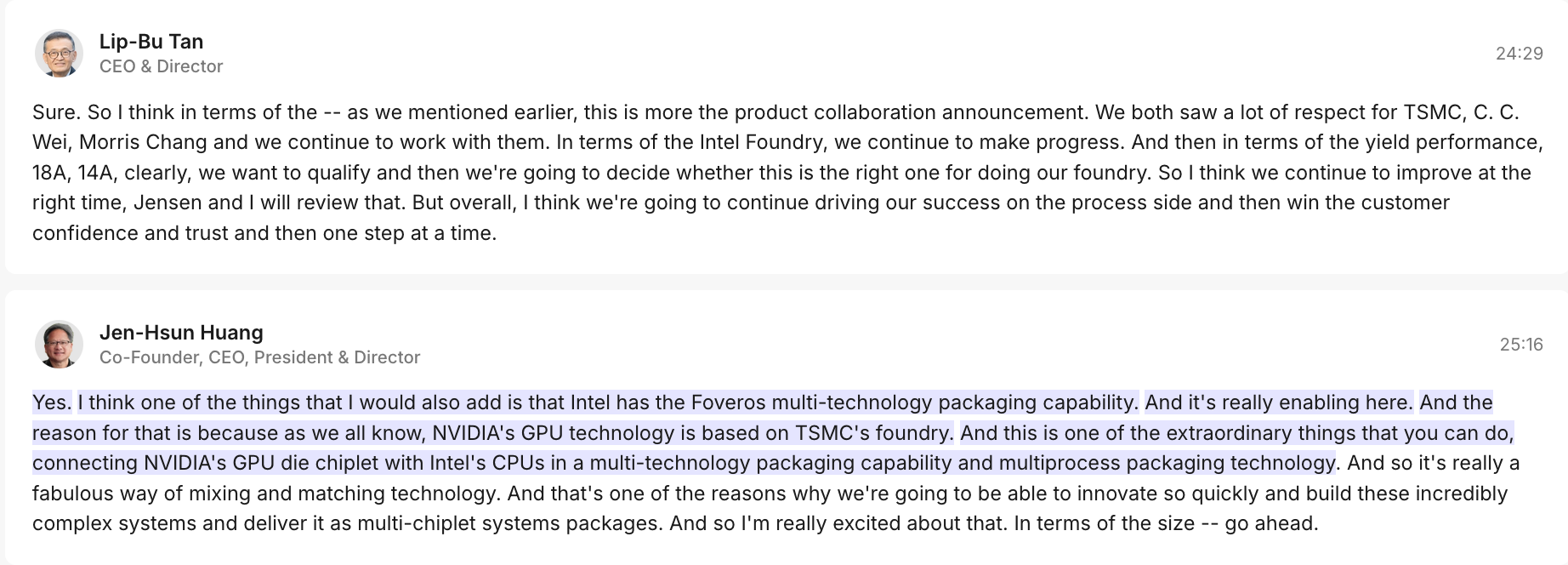Despite speculation, NVIDIA has not shifted GPU production to Intel based on my understanding of the new partnership. TSMC remains the most important supplier of NVIDIA’s leading-edge GPUs and CoWoS packaging. I believe TSMC’s technological lead in both process technology and advanced packaging should ensure it remains insulated from the impact of this deal and continues to hold a favorable position over Samsung and Intel in the overall foundry landscape. Notably, during the call co-hosted by LBT and Jensen, both explicitly acknowledged TSMC’s capability, referring to it as a ‘world-class foundry.