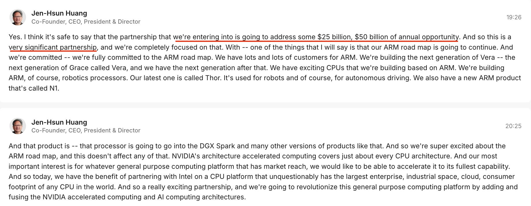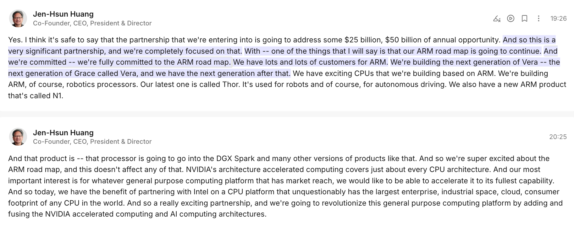 While the former could modestly reduce Arm’s share in AI servers, I don’t see a scenario in which NVIDIA abandons Arm architecture in its future roadmap (at least I haven’t seen one YET, and see Jensen’s comment in the call below). For example, given that NVIDIA’s VR300s should still be around 2027 and even early 2028, Arm’s status as NVIDIA’s beneficiary should be extended until then.