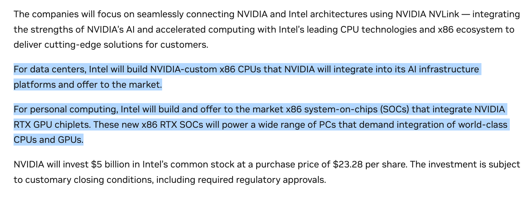 On September 18, NVIDIA (NVDA) and Intel (INTC) announced a broad co-development partnership covering data center and PCs, underpinned by NVIDIA’s $5B equity investment in Intel at $23.28/share (~4–5% stake). According to the statement, the collaboration will deliver x86 CPU + NVIDIA GPU tile systems for rack-scale AI infrastructure and new AI PC SoCs combining Intel CPU tiles with NVIDIA GPU chiplets. The announcement does not commit NVIDIA to Intel Foundry Services (IFS) for its GPUs.