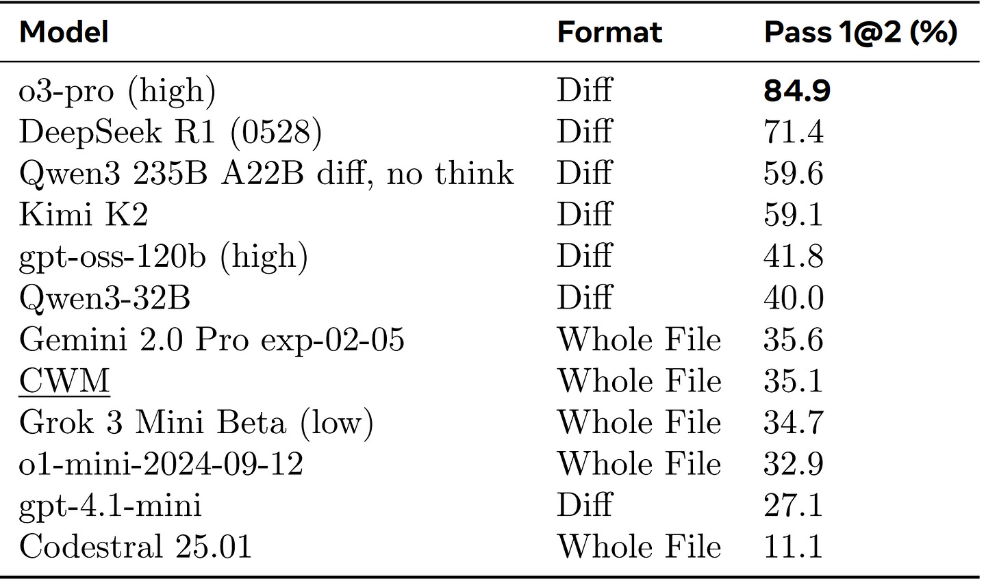 and force bash-only operation. Pass@1 drops to 42.1%. The model didn’t learn “file editing” as an abstract operation. It cached “call the edit tool, get back a snippet.” When bash doesn’t provide that snippet, the workflow breaks.Edit-grammar dependency. On Aider Polyglot, CWM scores 35.1% in whole-file edit mode. Diff-tuned models like DeepSeek R1 (71.4%) and o3-pro (84.9%) perform dramatically better. The gap isn’t about language competence — it’s dependence on edit-format conventions.