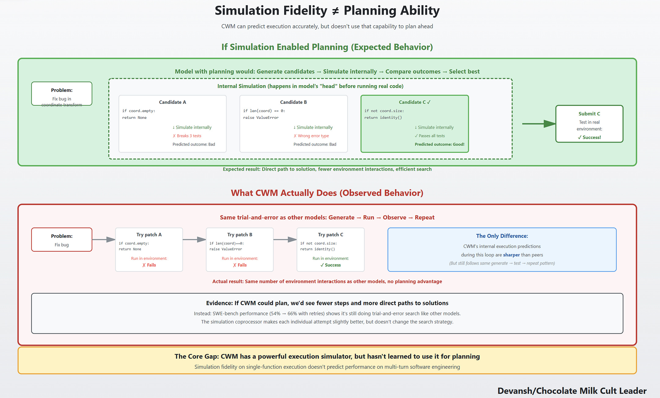 But simulation fidelity on single-function execution doesn’t predict performance on multi-turn software engineering. Those require planning: generating multiple candidate fixes, simulating their outcomes internally, comparing them, and selecting the best one before running anything in the real environment. If CWM had this ability, we’d expect it to solve harder problems in fewer steps, with more direct paths to solutions. Instead, it behaves like its peers: generate a patch, run it in the environment, observe the result, repeat. The difference is that its execution predictions inside this loop are sharper.