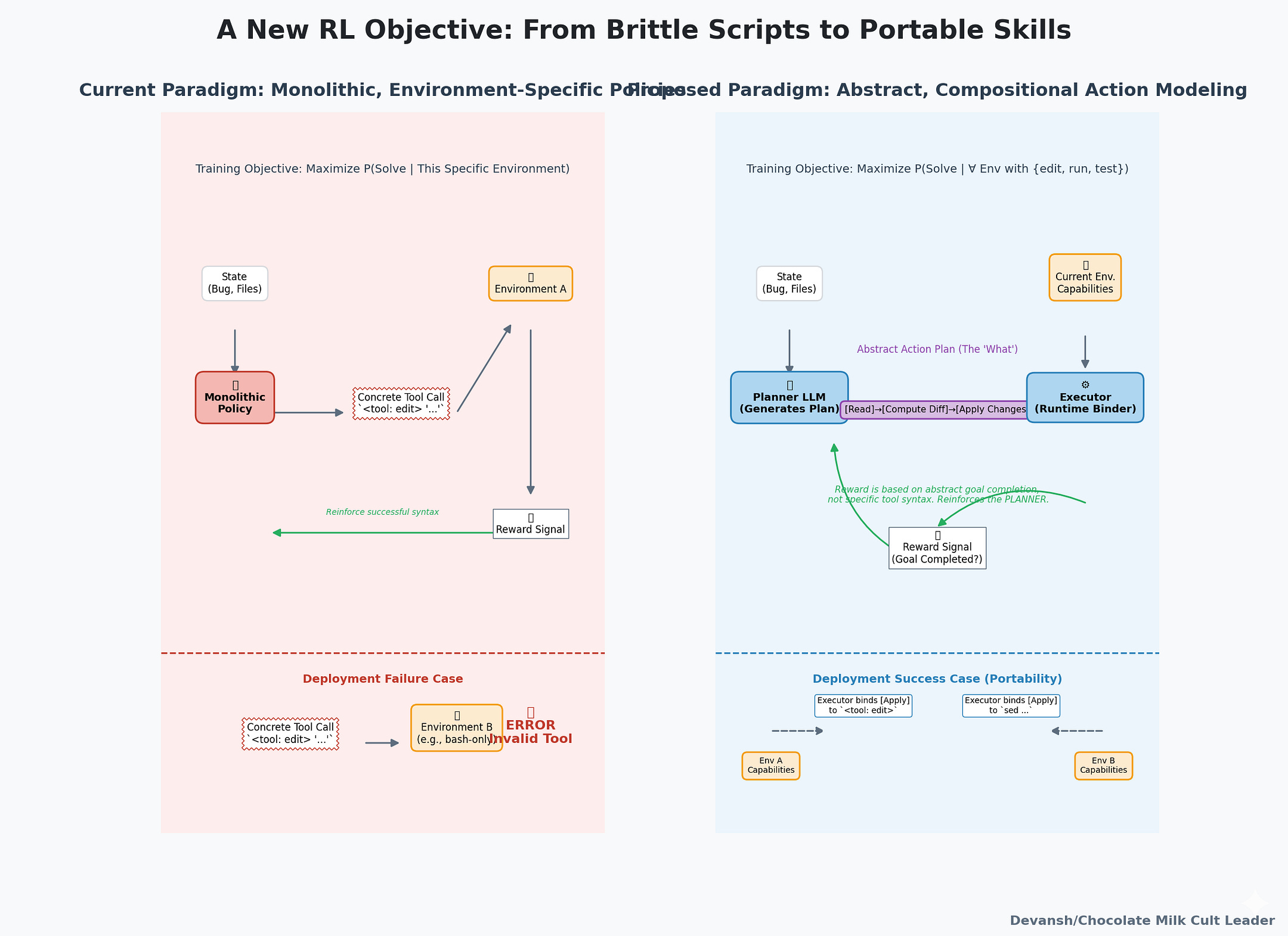 A true fix would require a different training objective. Current RL maximizes probability of solving tasks in this environment. The better target is: probability of solving tasks in any environment that provides primitive capabilities like edit, run, and test. That means compositional action modeling. Instead of caching “invoke <tool: edit>