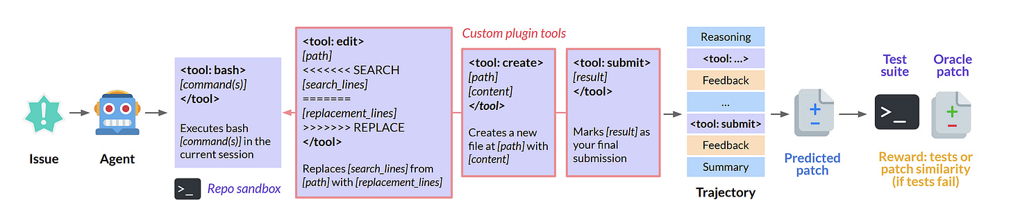 hands the model a formatted context snippet after every change, which provides a clear reward signal when tests pass. sed