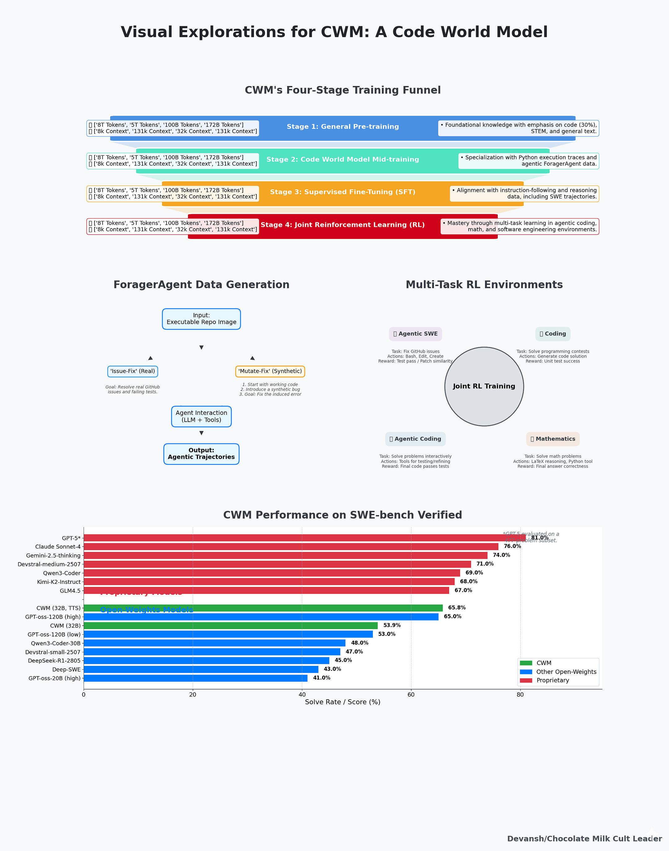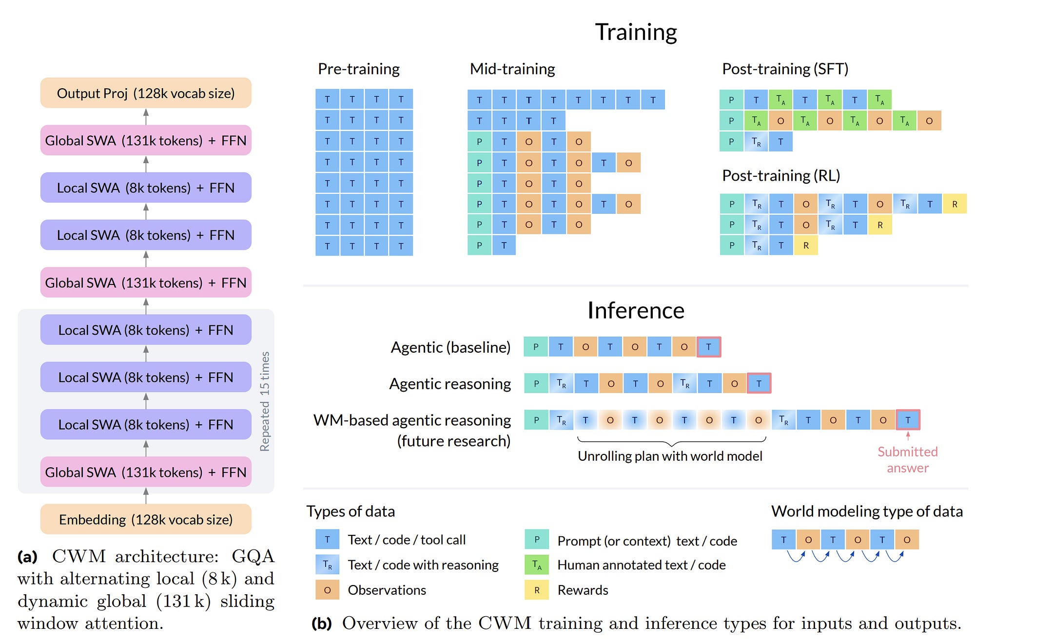CWM = trained on 120M Python execution traces + 3M agent trajectories, grounding code in execution, not just text.