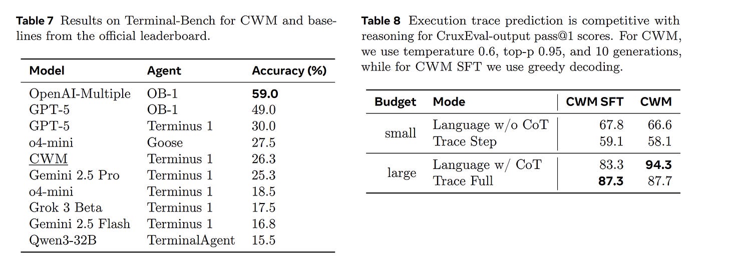 Environment scaffolding. On Terminal-Bench, which runs inside persistent tmux sessions, CWM hits 26.3% with the Terminus-1 agent . Same bug-fixing tasks, different scaffolding — persistent sessions, altered tool conventions, new turn cycles — and the cached policies collapse.