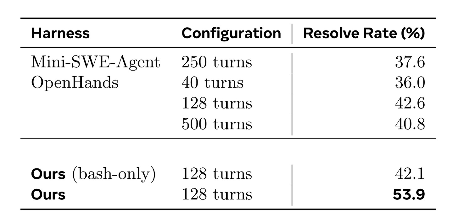 CWM’s 53.9% on SWE-bench Verified looks competitive — until you change anything about how it interacts with the environment. Then it collapses. Its strongest numbers appear only in its native harness: bash shell, custom <tool: edit>