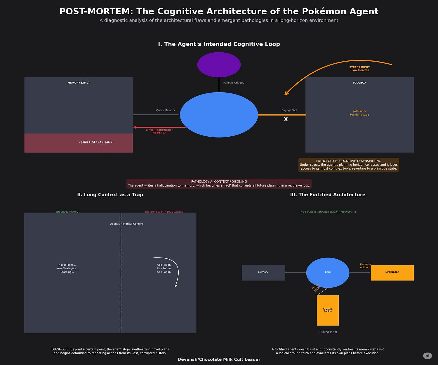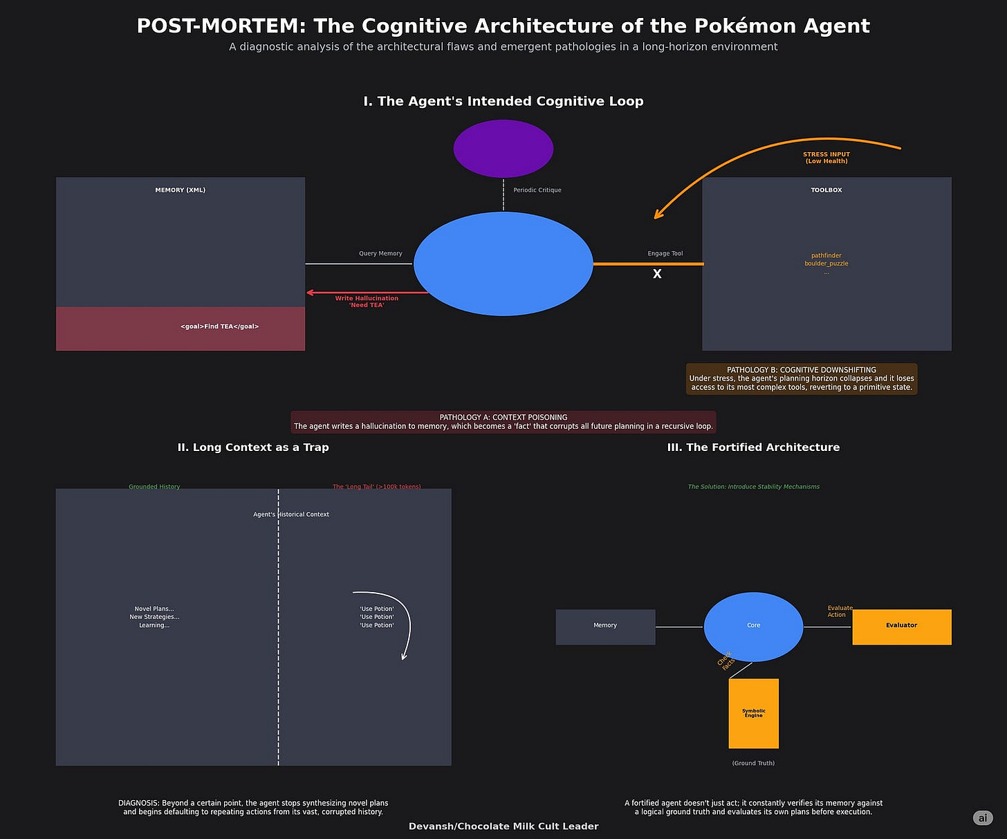 This reveals a fundamental flaw in current agent design: the lack of a ground truth mechanism. The agent’s memory is untethered from reality, making it susceptible to “context poisoning,” where a single error can corrupt the entire cognitive history. This connects directly to the paper’s admission that over long contexts, the agent defaults to “repeating actions from its vast history rather than synthesizing novel plans.” Of course it does — its history has become a corrupted script it is forced to re-enact.