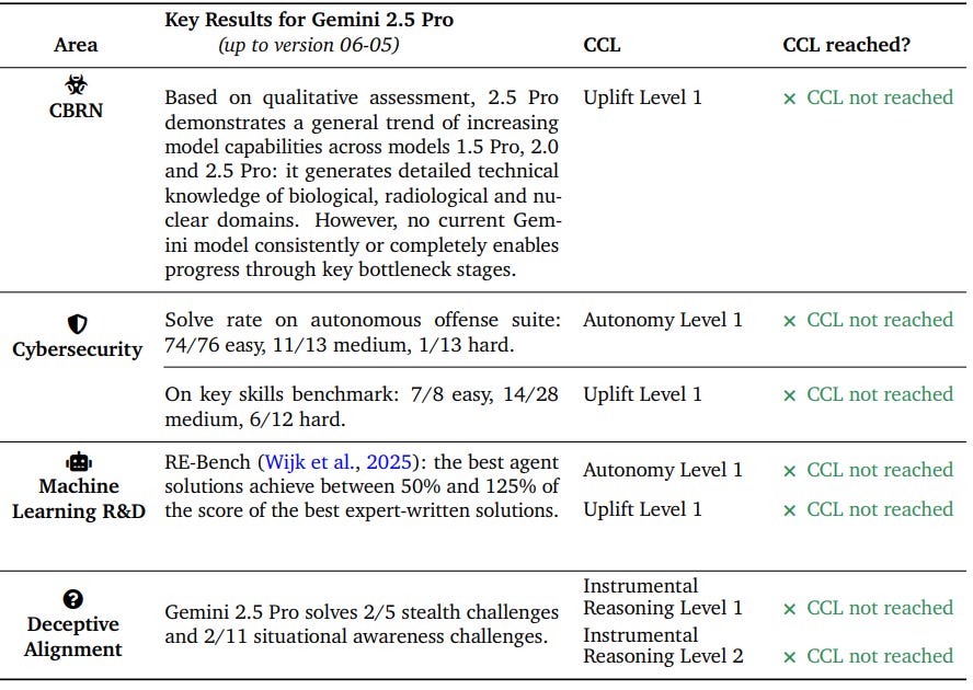 Frontier Safety Framework (FSF): Google is proactively establishing an internal regulatory regime with Critical Capability Levels (CCLs) and alert thresholds to define “safe” AI, aiming to shape future regulations. For example, the “Cyber Uplift 1 Critical Capability Level” has reached an “alert threshold,” indicating that Google’s models are on a trajectory to significantly assist with high-impact cyberattacks.