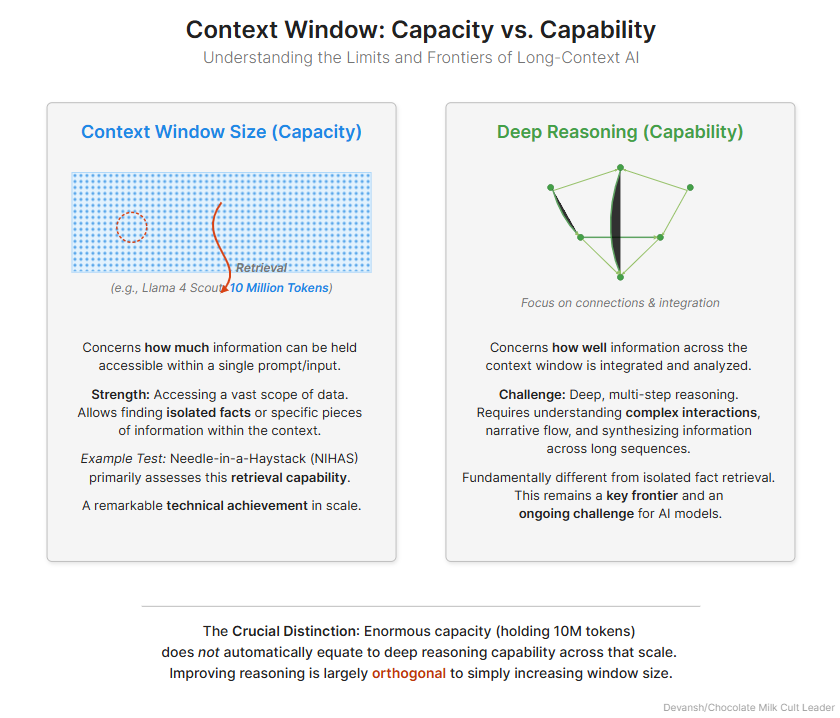 To reiterate my basic point from the Llama 4 breakdown, “Therefore, while Llama 4 Scout’s 10 million token context window is a remarkable technical achievement that significantly expands the potential scope of information a model can access in one go, it’s crucial to distinguish this capacity from the ability to perform deep, multi-step reasoning or synthesis across that entire context. Successfully retrieving isolated facts (the strength tested by NIHAS) is fundamentally different from integrating and analyzing complex interactions or narratives spanning long sequences. Mastering this deeper form of long-context understanding and integration, beyond simple retrieval, remains a key frontier and an ongoing challenge for the next generation of AI models and will require work that is orthogonal to the increasing max context window that our models can process.”