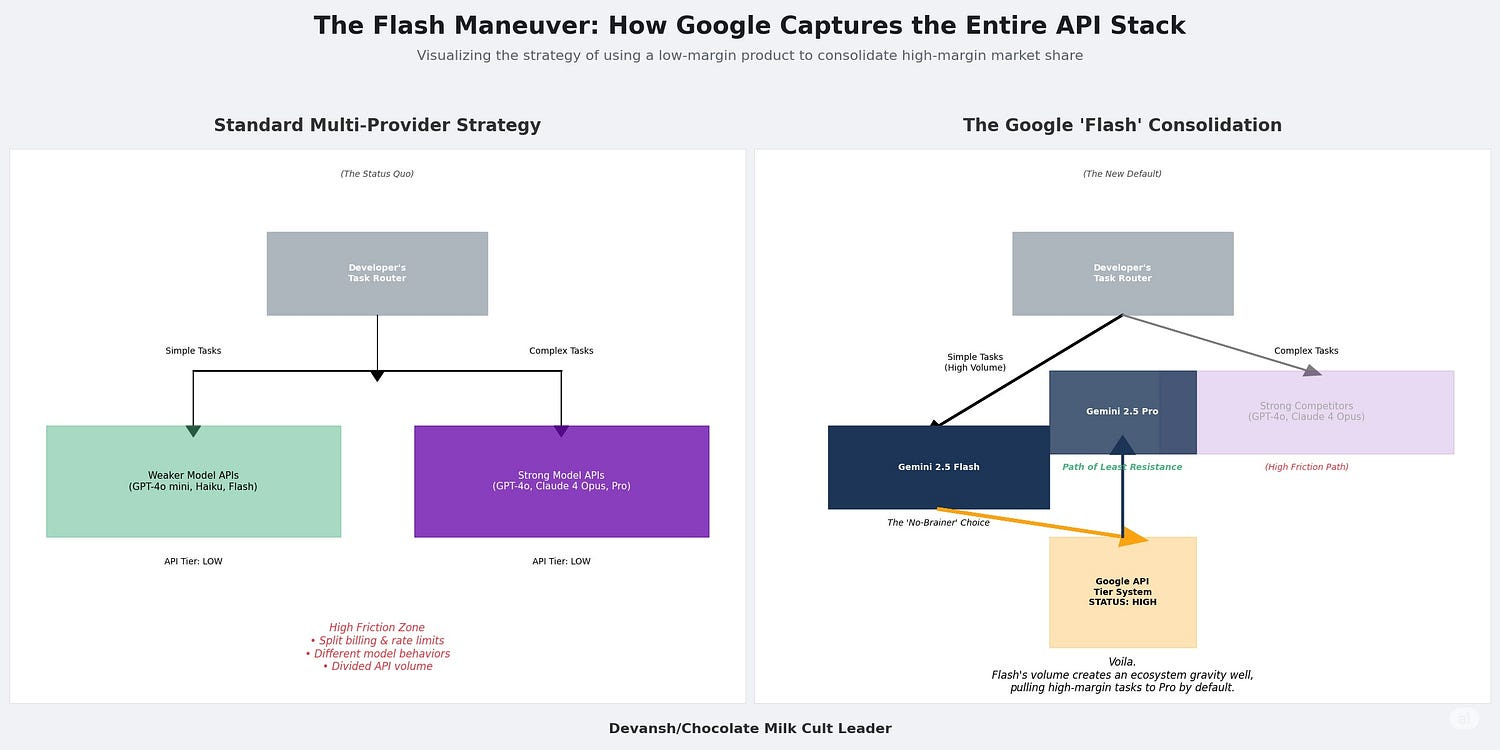 Market Compression: Flash’s low cost and high performance are designed to eliminate low-margin competitors and pressure premium models like Opus 4 and GPT-4o by making Google’s ecosystem the default for most API calls. This drives users to consolidate even complex tasks within Google’s more expensive Gemini 2.5 Pro, as managing multiple providers becomes less appealing.