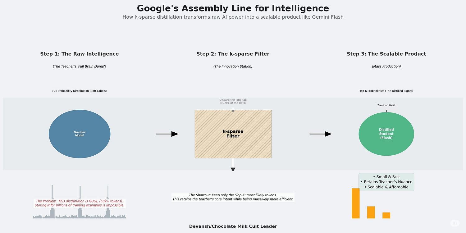 Flash’s superior cost-performance is due to k-sparse distillation, a technique where smaller models (“students”) learn from the predictions of larger, more capable models (“teachers”). Google’s unique advantages in applying this at scale include: