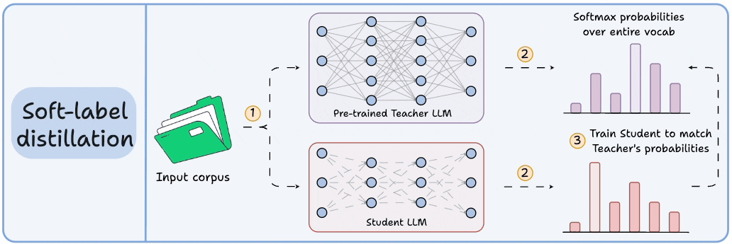 Step 2: The Cost Problem: Capturing the entire distribution (i.e., the teacher’s predicted probability for every word in the vocabulary) is expensive. For a vocabulary of 50,000 tokens, storing full distributions for billions of examples becomes unscalable, both in compute and storage.