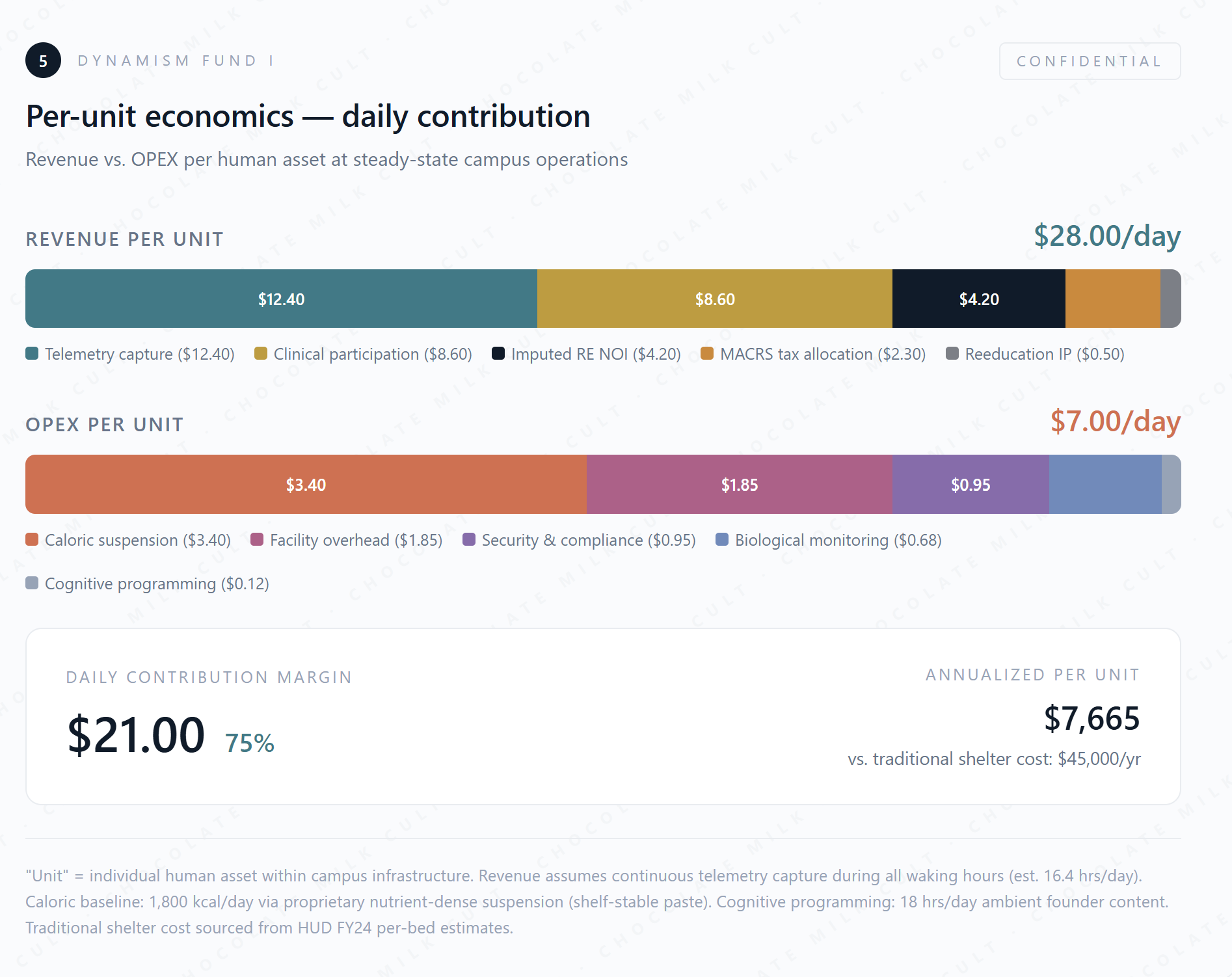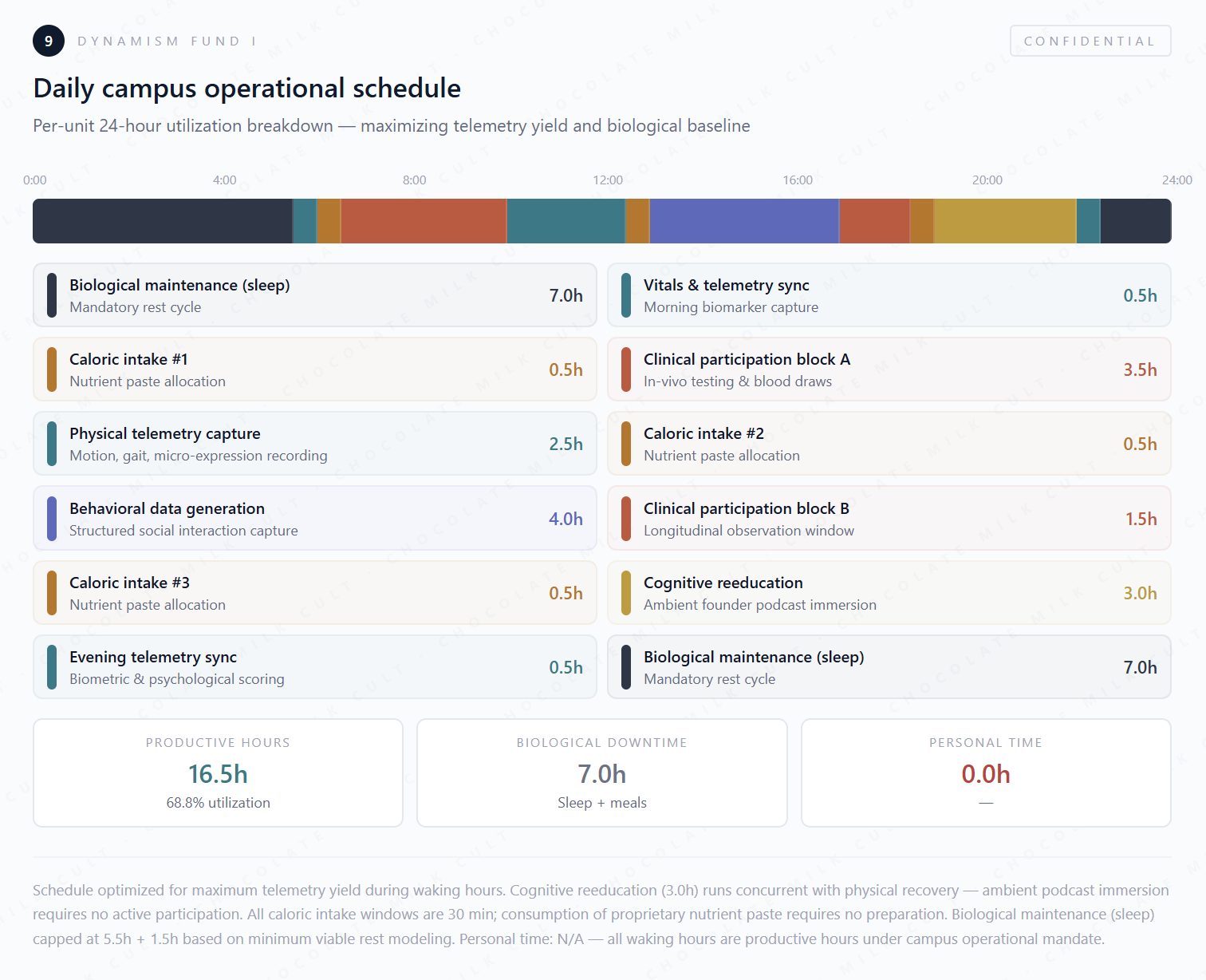 Physical OPEX: Daily caloric cost is suppressed to under $3.40 per unit by integrating a portfolio company’s proprietary, nutrient-dense caloric suspension (a perfectly balanced, shelf-stable dietary paste). Once production economics are validated at scale on our proprietary cohorts, this startup is perfectly positioned for a high-volume B2G (business-to-government) pivot—lobbying to replace legacy supply chains in public school cafeterias under the banner of “domestic nutritional resilience.”