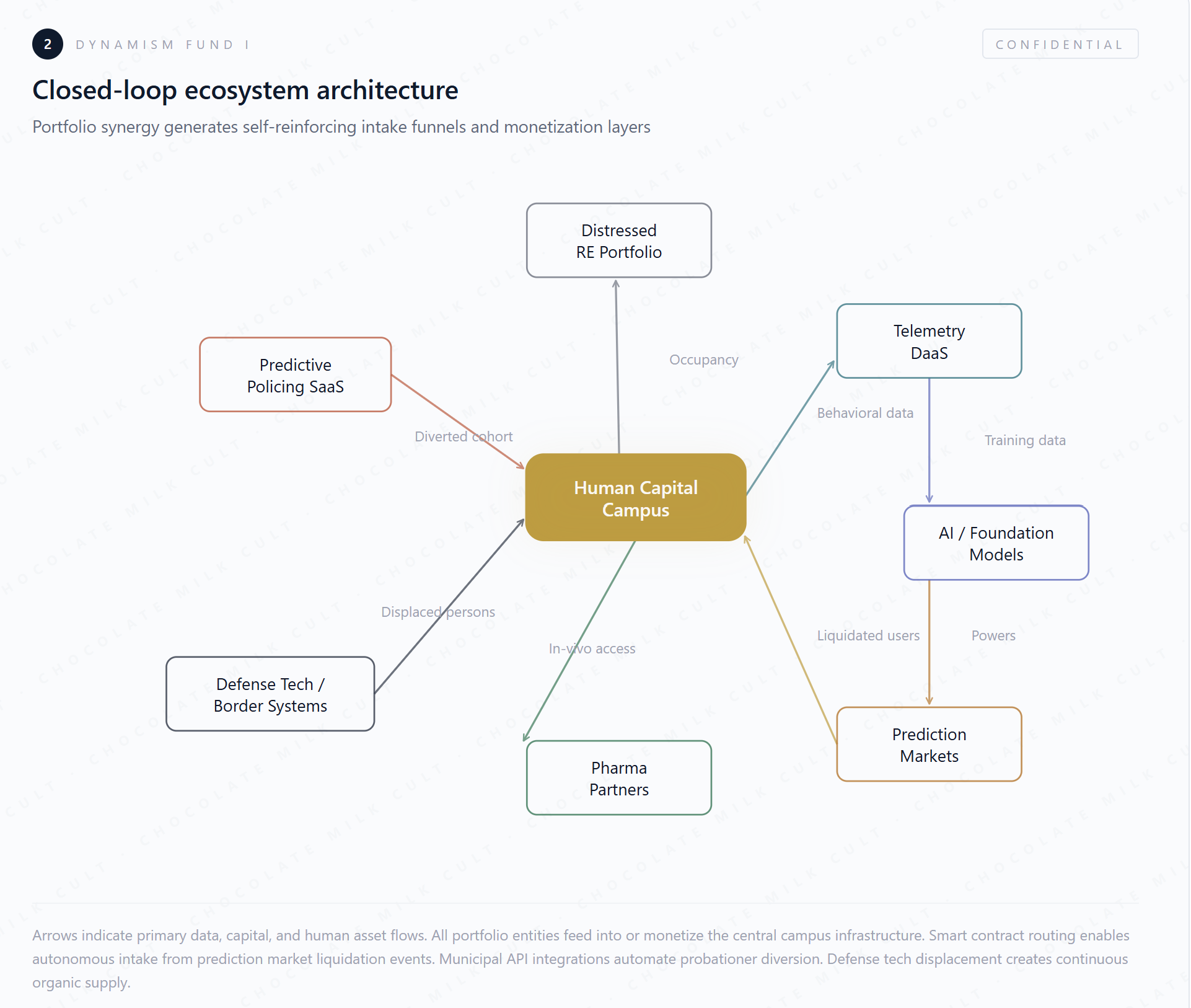 Retail Synergy & Prediction Markets: As retail users engage with our consumer crypto and prediction market platforms to aggressively “price the future”—betting their savings on macroeconomic events, elections, and cultural shifts—a statistically guaranteed cohort will face total capital liquidation. Instead of falling out of the economy and becoming a burden on the state, our smart contracts instantly route these liquidated users into our infrastructure portfolio. They transition seamlessly into the campuses, where they are compensated in prediction market credits, ensuring their behavioral output is entirely recaptured by our ecosystem.