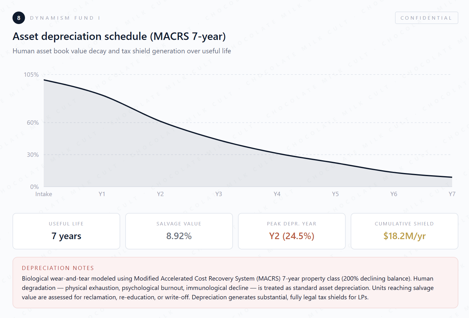 Furthermore, this asset base provides unprecedented downstream tax advantages. Biological wear-and-tear is inevitable. By modeling cohort exhaustion (physical or psychological burnout) using Modified Accelerated Cost Recovery System (MACRS) principles, we can treat human degradation as standard asset depreciation, generating massive, highly legal tax shields for our Limited Partners.