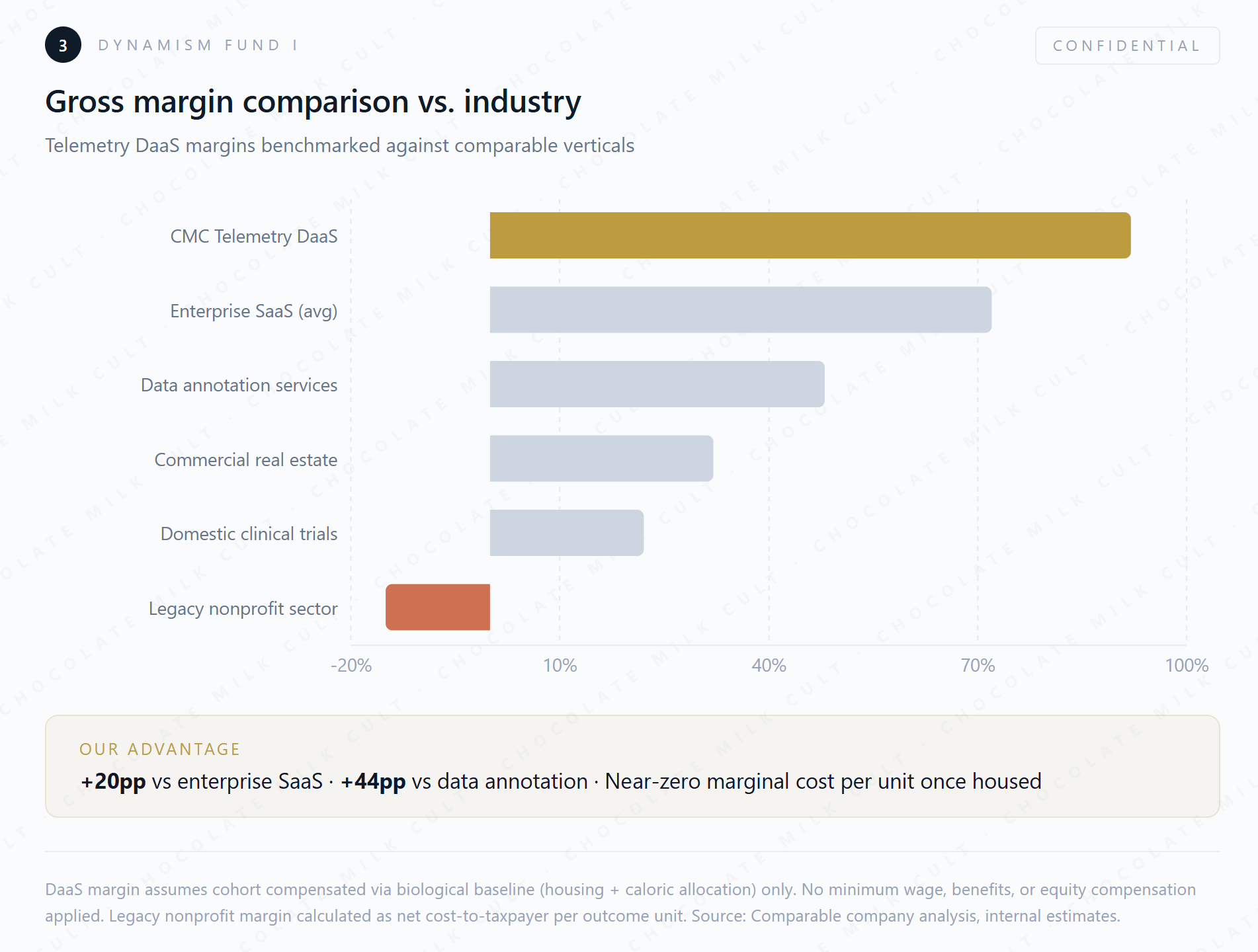 Our campuses act as closed-loop telemetry environments. We continuously harvest the physical interactions, emotional volatility, micro-expressions, and edge-case behaviors of the cohort to train the next generation of multimodal architectures. Because the underlying hardware (the human substrate) requires near-zero CapEx once housed, our OPEX is entirely decoupled from traditional labor markets. We are not burdened by minimum wage laws, unionization friction, or market-rate data annotation costs. The cohort is compensated entirely through baseline biological continuation (housing and food) and a minimal stipend for participating in research. This absolute labor arbitrage allows our Data-as-a-Service (DaaS) subscriptions to generate software-like 92% gross margins.