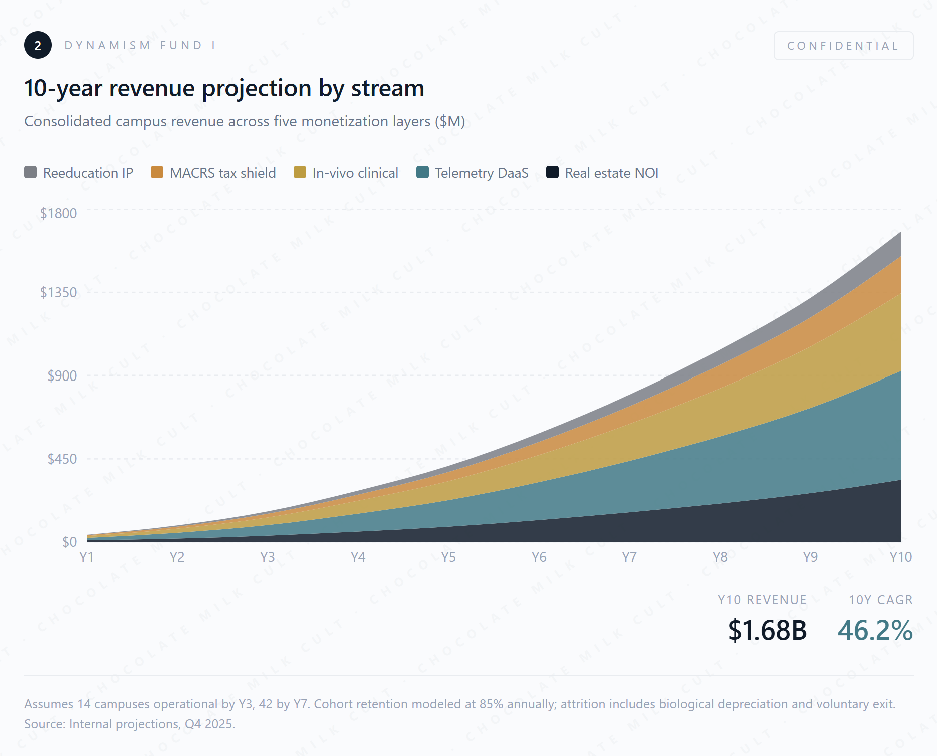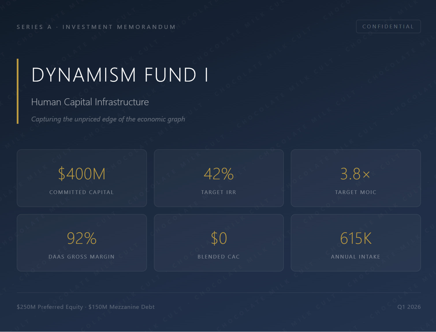 To capture this unprecedented market value, our Dynamism Fund recently led a $400M Series A (structured as $250M in preferred equity and $150M in mezzanine debt) to scale vertically integrated “Human Capital Campuses.” Our baseline 10-year Discounted Cash Flow (DCF) model underwrites a 42% IRR and a 3.8x Gross MOIC (Multiple on Invested Capital).