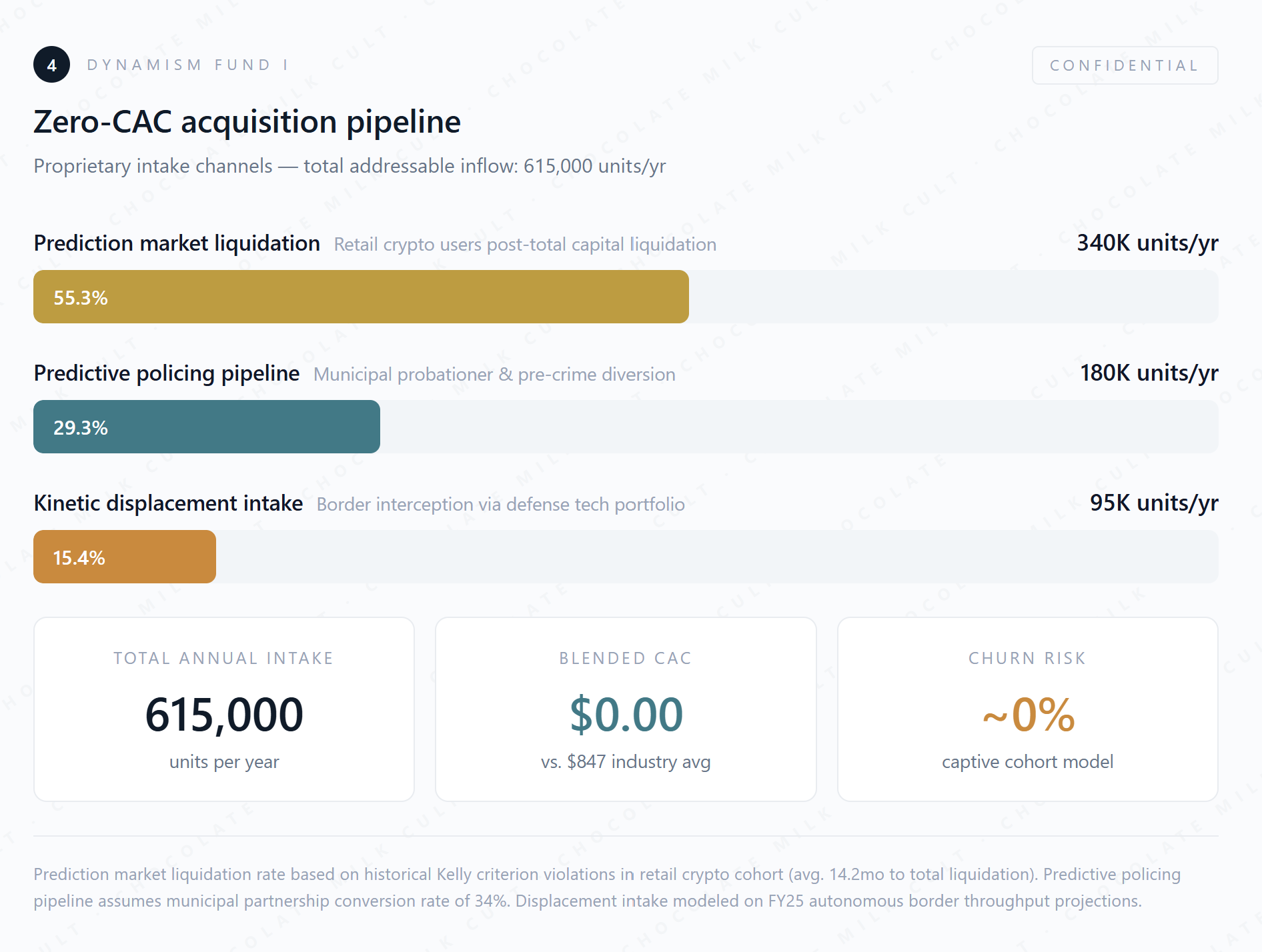 4. Zero-Basis Acquisition Funnels and Tax Shielding In a traditional consumer tech business, Customer Acquisition Cost (CAC) is the primary destroyer of capital. For the Human Capital Campuses, CAC is effectively zero. The Total Addressable Market (TAM) is continuously replenished via zero-cost funnels directly from our broader venture portfolio. We have transformed societal friction into proprietary asset flow: