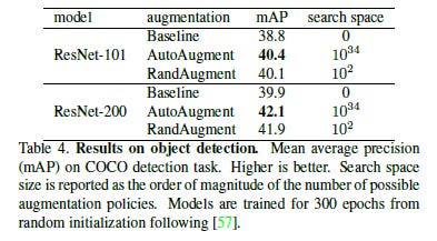 Object detection is a thriving area. It is crucial for self-driving cars and other such areas. In this task, we see RA have lower performance than AA. However, it’s interesting to note that RA still improves the baseline and is competitive with AA. This is impressive since AA uses 15K GPU hours, while RA was tuned on 6 parameters.