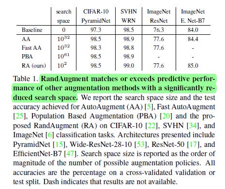 The average performance is stunning. RandAugment goes through a dramatically smaller. AA, the next smallest has a Nonillion times bigger search space. That is a difference of 1,000,000,000,000,000,000,000,000,000,000 times. Yikes. And RA still does better than it. PBA has the biggest search space. The number of possible solutions, is greater than the number of atoms in our Sun (by a factor of 10,000). RA beats that too.