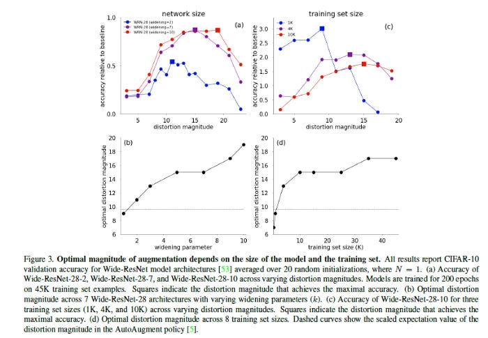 Figures 3b and d (right column)also show something similar. It’s clear that models trained on smaller training sets may gain more improvement from data augmentation (e.g. 3.0% versus 1.5% in Figure 3c). This makes sense since the relative increase in data-size on the addition of another image is higher for smaller datasets. Interestingly, “Figure 3d demonstrates that the optimal distortion magnitude increases monotonically with training set size.” Combining both these factors, “this trend highlights the need for increasing the strength of data augmentation on larger datasets and the shortcomings of optimizing learned augmentation policies on a proxy task comprised of a subset of the training data. Namely, the learned augmentation may learn an augmentation strength more tailored to the proxy task instead of the larger task of interest.”